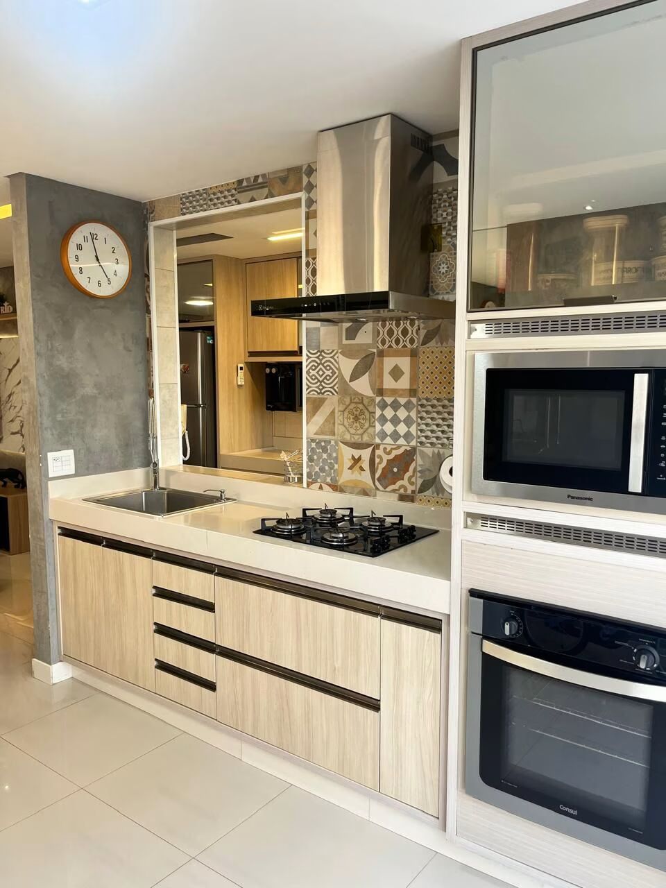 -Cozinha e área de serviço completa com: torre quente com forno, microondas, coifa, cooktop e máquina lava e seca.